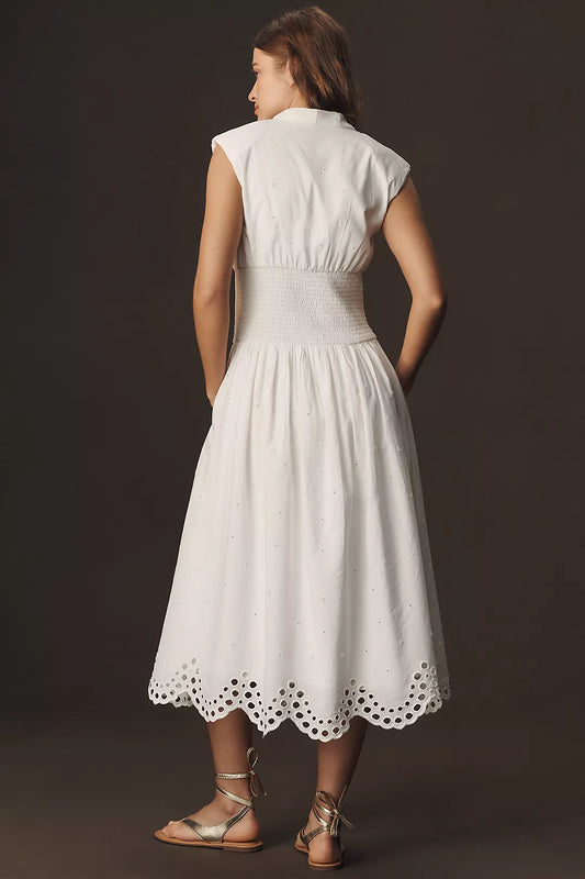 Anthropologie The Tommie Cap-Sleeve Smocked Front-Zip Shirt Dress: Eyelet-Trim Edition(Surplus)