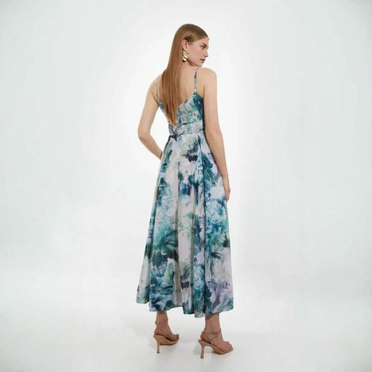 K🤍REN MILLEN Watercolour Cotton Voile Plunge Strappy Woven Maxi Dress
