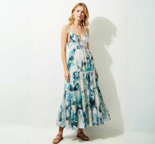 KAREN MILLEN Watercolour Cotton Voile Plunge Strappy Woven Maxi Dress