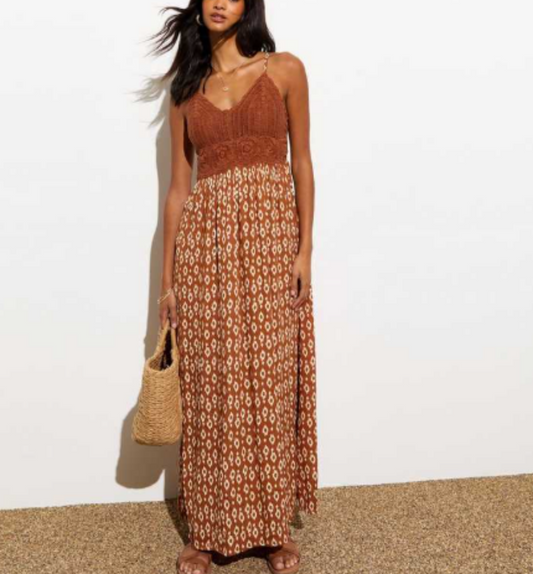 NEW LOOK Brown Crochet Bust Square Print Maxi Dress