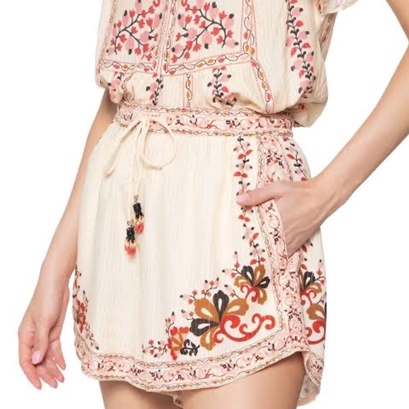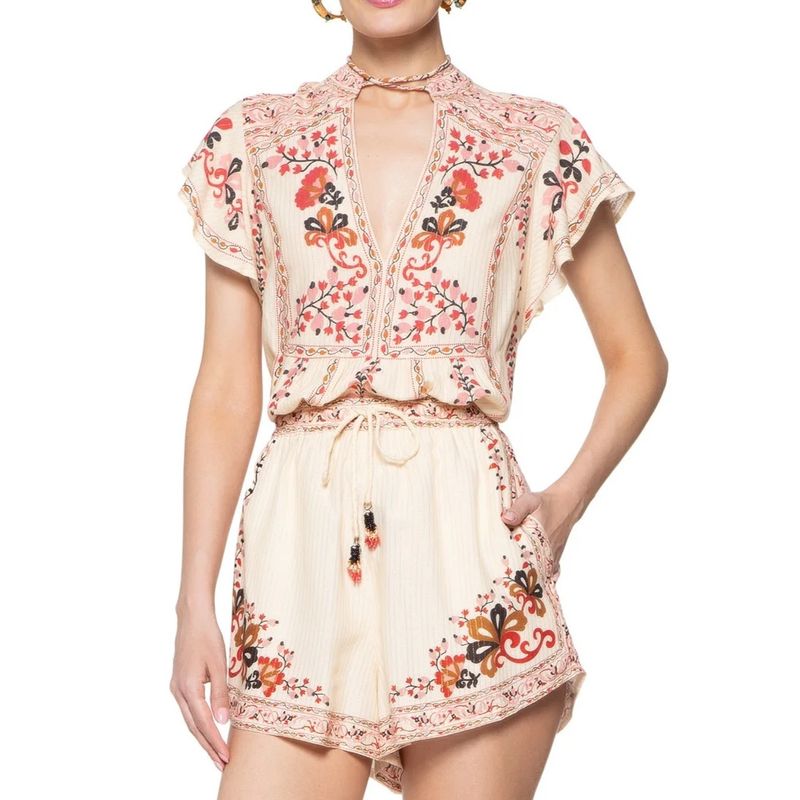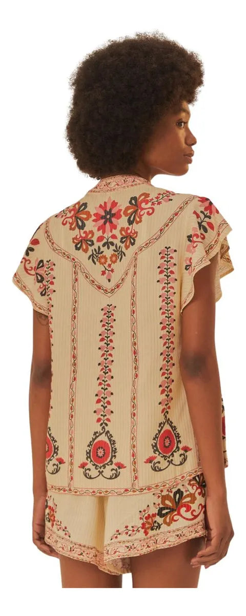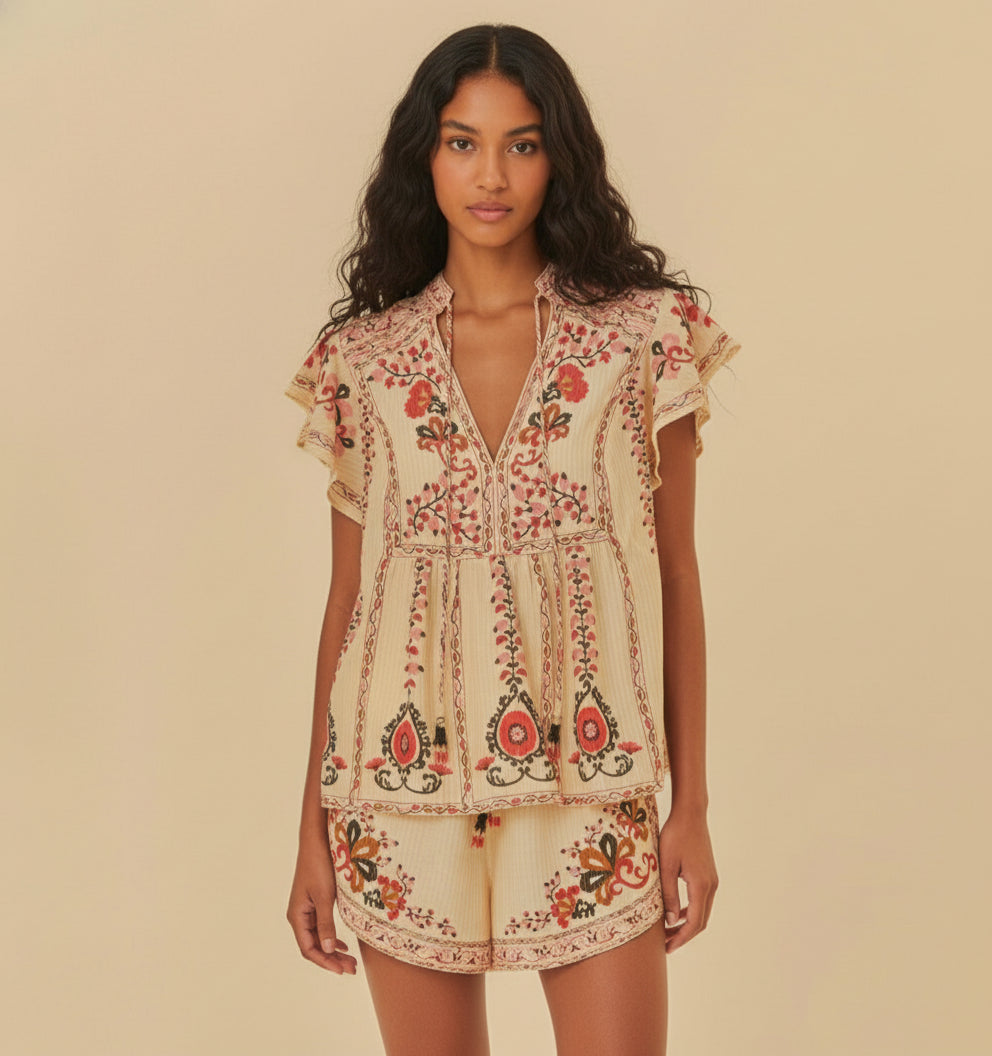 Cashew mandala shorts made of light and fresh fabric, with an elastic waistband for greater comfort, decorative drawstring and a wide hem finish.